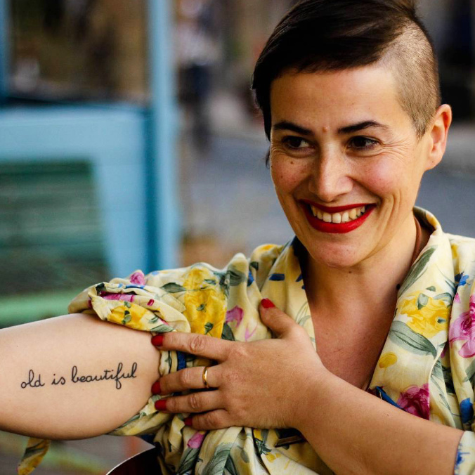 "Old is beautiful" is the sentence that has been in my head for 13 years. An idea which started to form while spending time with my grandma, playing with fabrics, scissors and listening to her stories. As a designer I combine product design with traditional knowledge and social innovation, working with local communities, and elderly groups, long term unemployed,disabled, immigrants and others. In 2014, Grandma Came to Work received its first seed funding and to celebrate I tattooed this sentence in my skin.